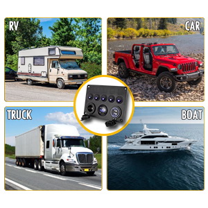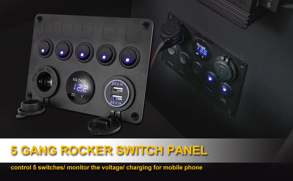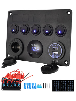 Product is combine with a dual USB charger, digital Voltmeter, 12V outlet, waterproof panel, and 5 on/off toggle switches, this 12V/24V rocker switch panel can meet your various needs while steering and widely applicable for most 12V-24V DC cars, UTVs/ATVs, trucks, trailers, RVs, caravans, buses, marine boats, yachts, airplanes, etc.