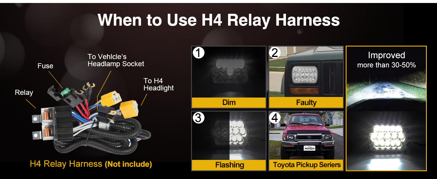 - 【Tips】Toyota Series with Dual Ground: Some vehicles such as Toyota May have a different PIN OUT (Low,High, Ground) than factory shipped lamps. You simply have to re-arrange the pins. Please search in Partsam store " Partsam H4 9003 relay ", then you will find the relay. There are lots of installation about H4 relay harness on internet.