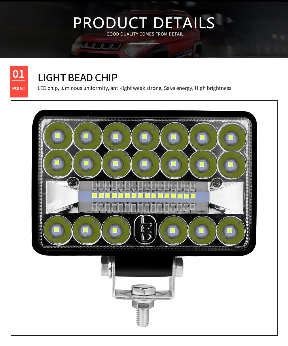 Material: Aluminum + LED Working Voltage: DC9-30V LED Chips: 3030 LED Quantity: 36pcs LED Power: 108W Measured Current: 1.5A±0.2 Lumens: 5400M Color Temperature: 6500K Beam Type: Spotlight + Floodlight Waterproof Level: IP67 Service Life: 50000H Operating Temperature: -40℃-85℃ Applications: Automobiles/Motorcycles/Off-road Vehicles/Trucks/Forklifts/ATVs/Construction Vehicles/Boats Product Weight: 300g Inner Box Dimensions: 175×110×45mm |