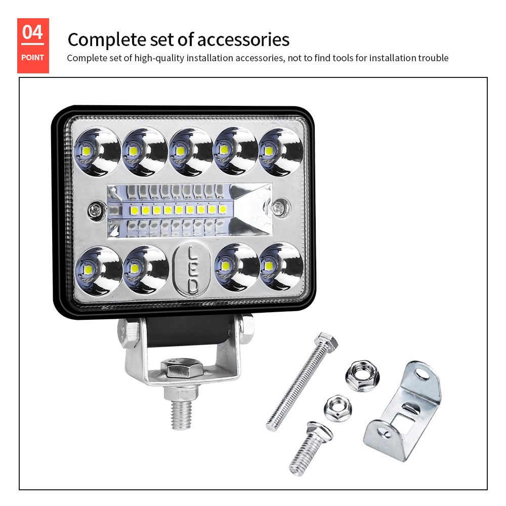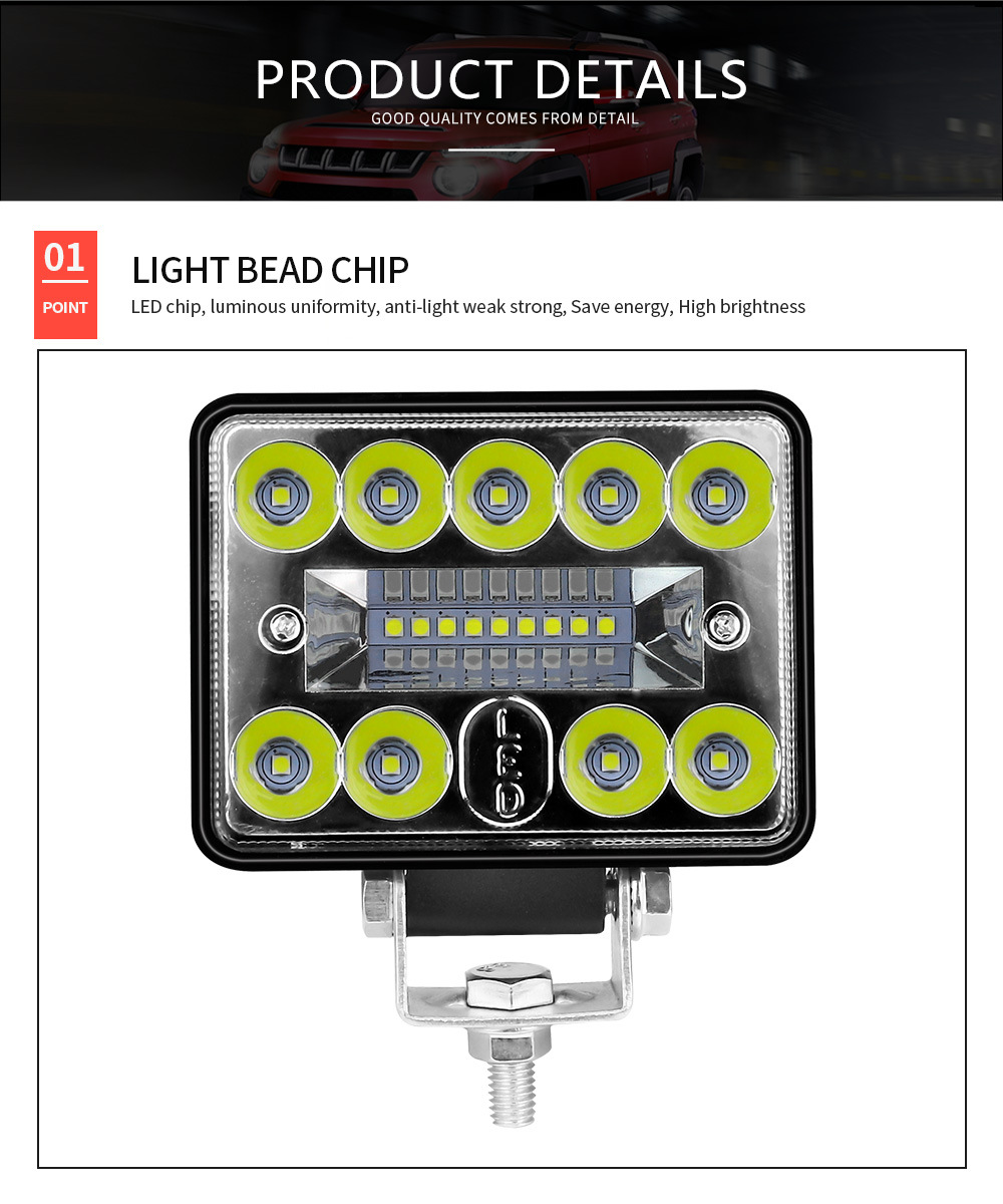 Material: Aluminum + LED Working Voltage: DC9-30V LED Chips: 3030 LED Quantity: 18pcs LED Power: 54W Measured Current: 1A±0.2 Lumens: 2800M Color Temperature: 6500K Beam Type: Spotlight + Floodlight Waterproof Level: IP67 Service Life: 50000H Operating Temperature: -40℃-85℃ Applications: Automobiles/Motorcycles/Off-road Vehicles/Trucks/Forklifts/ATVs/Construction Vehicles/Boats Product Weight: 230g Inner Box Dimensions: 58×30×27mm